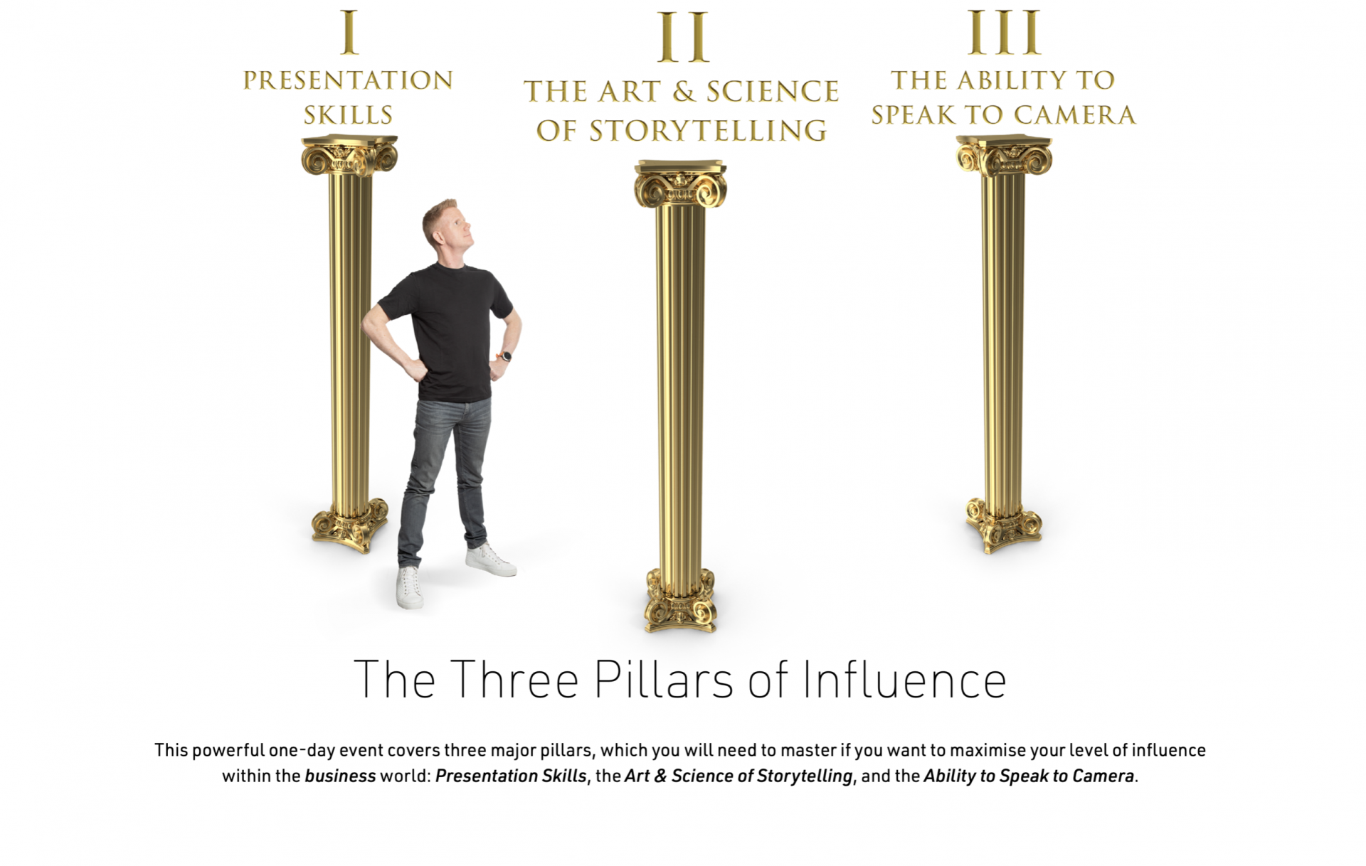This event covers three major pillars, which you will need to master if you want to maximise your level of influence: presentation skills, the art (and science) of storytelling, and the ability to speak to camera.